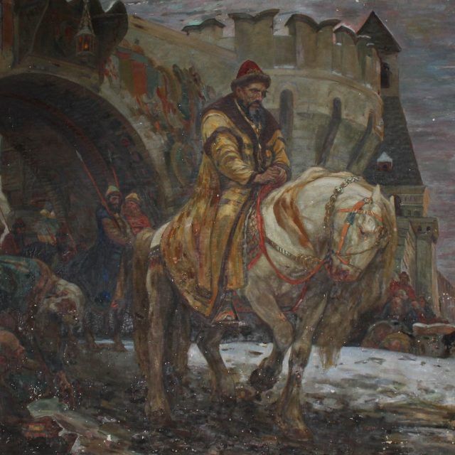 Картина "Таємний виїзд Івана Грозного перед опричниной" зображує сцену 16-го століття: російський цар Іван IV, відомий як Іван Грозний, виїжджає зі свитою з кремлівських воріт.