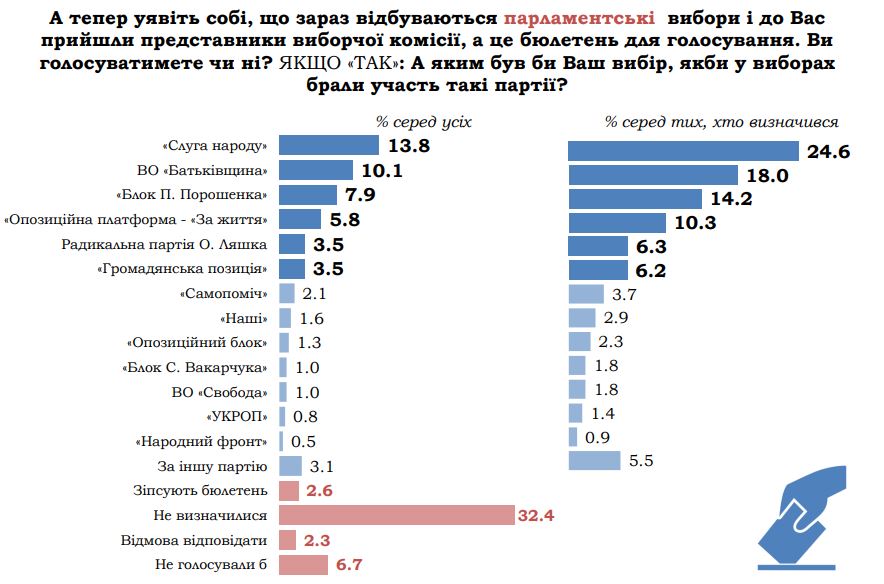Якщо розрахувати відсотки по відношенню до тих, хто визначився, то пройти до Верховної ради найбільші шанси мають партія "Слуга народу" з 24,6% голосів підтримки, 18% готові проголосувати за партію ВО "Батьківщина", 14,2% – за партію "Блок Петра Порошенка "Солідарність", 10,3% – за партію "Опозиційна платформа – "За Життя", та по 6,3% та 6,2% – за Радикальну партію Олега Ляшка і партію "Громадянська позиція".