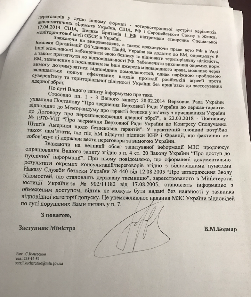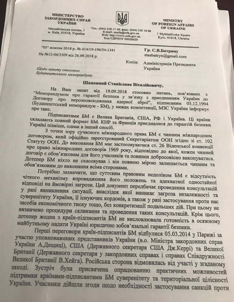 Зі свого боку, США наполягають на залученні до переговорів всіх підписантів угоди, разом з Росією. При таких умовах, свою згоду на залучення до переговорів надає Китай і Франція. На основі політико-правових зобов'язань, передбачених положеннями Будапештського Меморандуму, Україна повинна ініціювати створення міжнародної групи (коаліції) з протидії збройної агресії Російської Федерації. Приєднання до такої групи повинно бути відкритим для інших країн світу.