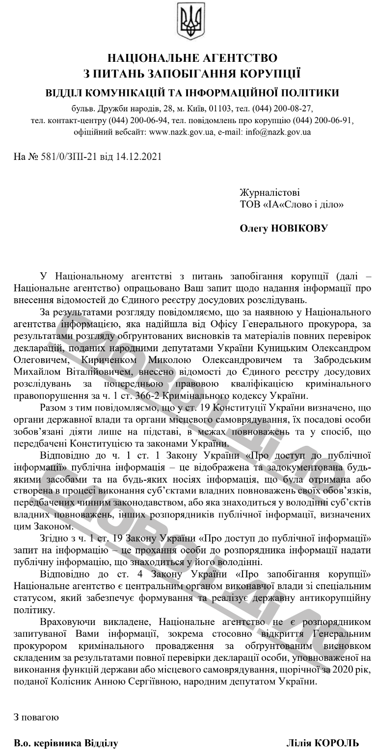 "За результатами розгляду повідомляємо, що за наявною у Національного агентства інформацією, яка надійшла від Офісу генерального прокурора, за результатами розгляду обґрунтованих висновків та матеріалів повних перевірок декларацій, поданих народними депутатами Олександром Куницьким, Миколою Кириченком та Михайлом Забродським, внесено відомості до Єдиного реєстру досудових розслідувань за попередньою кваліфікацією кримінального правопорушення за частиною 1 статті 366-2 Кримінального кодексу України (недостовірне декларування)", - цитує ЗМІ відповідь НАЗК на запит.