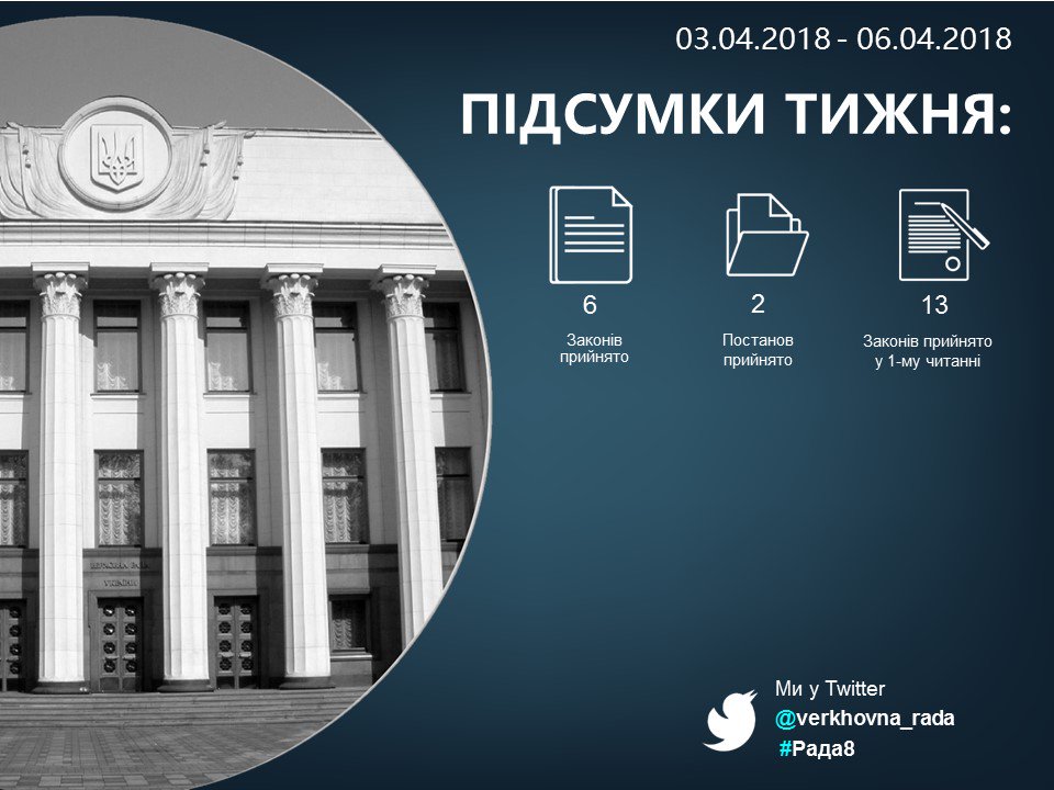 Найпродуктивнішим днем на цьому тижні був четвер, 5 квітня. У цей день Рада прийняла закон "Про дипломатичну службу" у новій редакції і схвалила президентський законопроект про нацбезпеку в першому читанні.