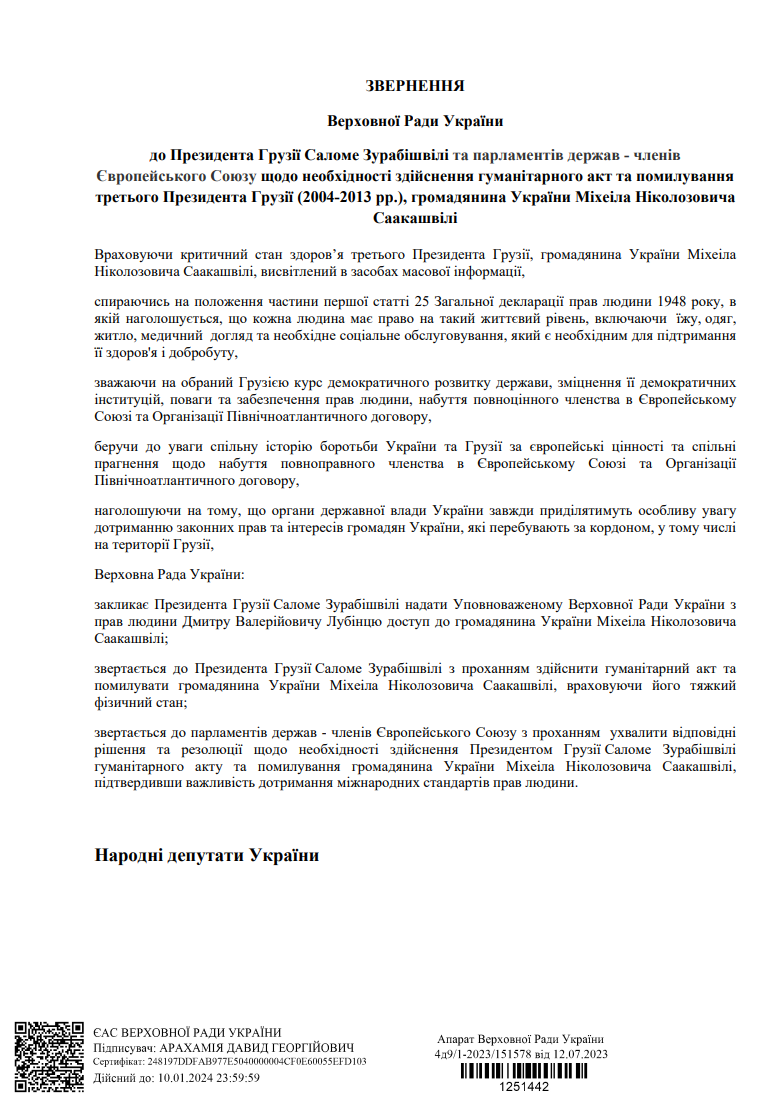 Верховна Рада України звернулася до президентки Грузії Саломе Зурабішвілі та парламентів держав - членів ЄС із закликом здійснити гуманітарний акт та помилувати третього президента Грузії, громадянина України Міхеіла Саакашвілі. За відповідну постанову на засіданні 14 липня проголосували 285 народних депутатів, повідомив депутат Ярослав Железняк.