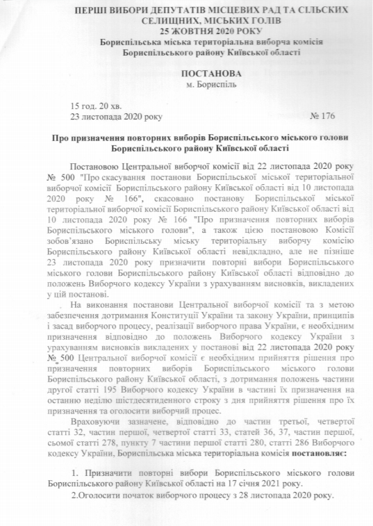 Бориспільська міська ТВК призначила повторні вибори на посаду міського голови на 17 січня 2021 року. Початок виборчого процесу припадає на 28 листопада. Про це йдеться у постанові ТВК № 176 від 23 листопада 2020 року, передає громадянська мережа ОПОРА.
