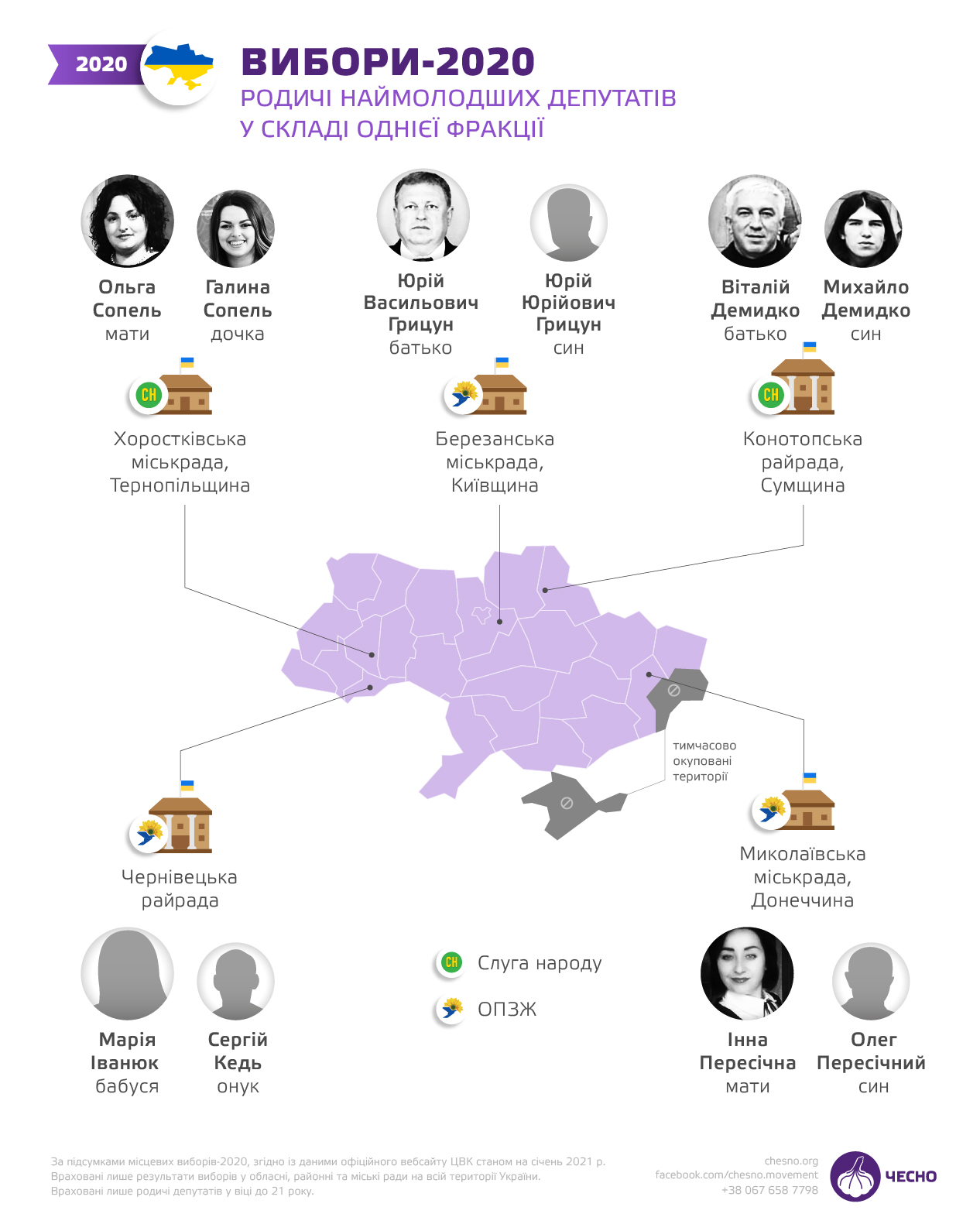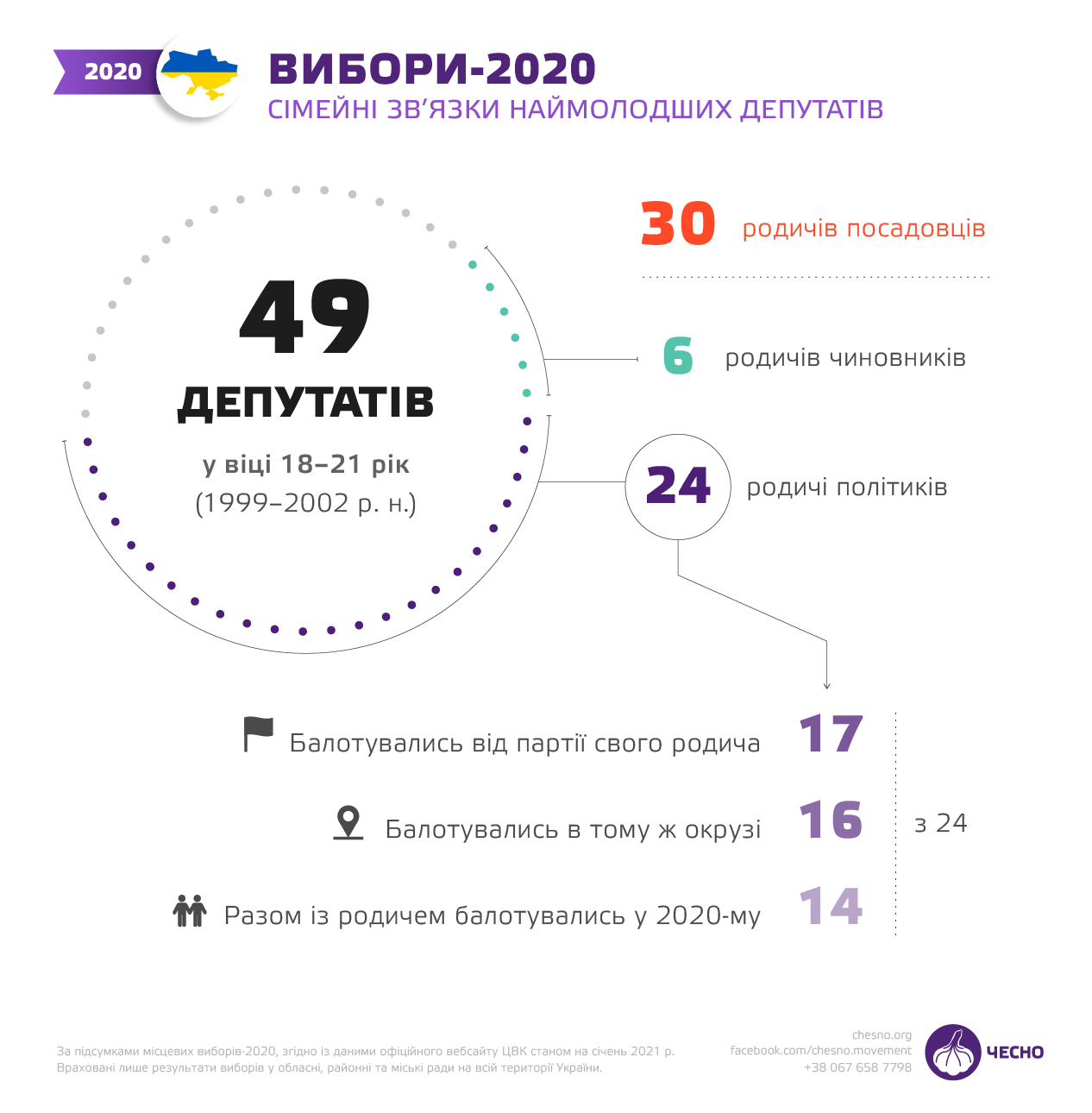 Всього, за даними “Чесно”, щонайменше 30 із 49 молодих депутатів є родичами політиків, місцевих чиновників або суддів. При чому у випадку з 22 “юніорами” кар’єрі своєї дитини сприяв впливовий батько. Шість разів кандидатам допомагали політичні зв’язки матері. В інших випадках впливовим родичем був дядько. У 24 із 30 молодих депутатів родичі були парламентаріями; депутатами місцевих рад, або балотувалися до неї хоча б раз; були сільськими або селищними головами чи кандидатами на цю посаду. Родичі ще шістьох молодих депутатів жодного разу не балотувалися до місцевих рад, але вони є чи були місцевими чиновниками.