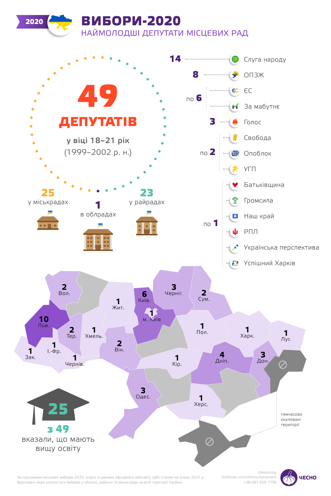 За результатами минулорічних місцевих виборів до районних, міських та обласних рад потрапили майже півсотні депутатів у віці 18-21 років, повідомили у Громадському русі “Чесно”. При цьому третину з цих депутатів завела у ради партія “Слуга народу”. Ще щонайменше дві третини з цієї півсотні “юніорів” – є родичами політиків або місцевих чиновників.