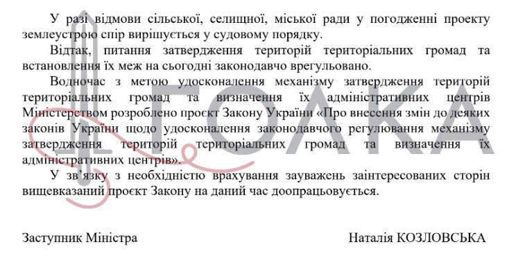 Експерт із територіального розвитку та місцевого самоврядування Павло Остапенко зазначає, що давно пропонував, як із мінімальними затратами це зробити: «Мінрегіон із Держгеокадастром мають розробити векторний файл і розмістити його на публічній кадастровій карті. По суті це шар геопросторових даних. У ньому мають бути межі територіальних громад. Усе, що треба зробити, — це внести зміни до Закону «Про землеустрій». Там нема чого робити — три абзаци дописати, що у громад є два роки, щоб розпочати процес розроблення проєкту землеустрою про встановлення меж. Деякі громади справді можуть погоджувати межі протягом тривалого часу, але держава має їх виявити й розуміти ситуацію. Проте більшість громад установить свої межі за принципом мовчазної згоди, й це збереже три мільярди гривень бюджетних коштів. Ви уявіть, яка це сума!»