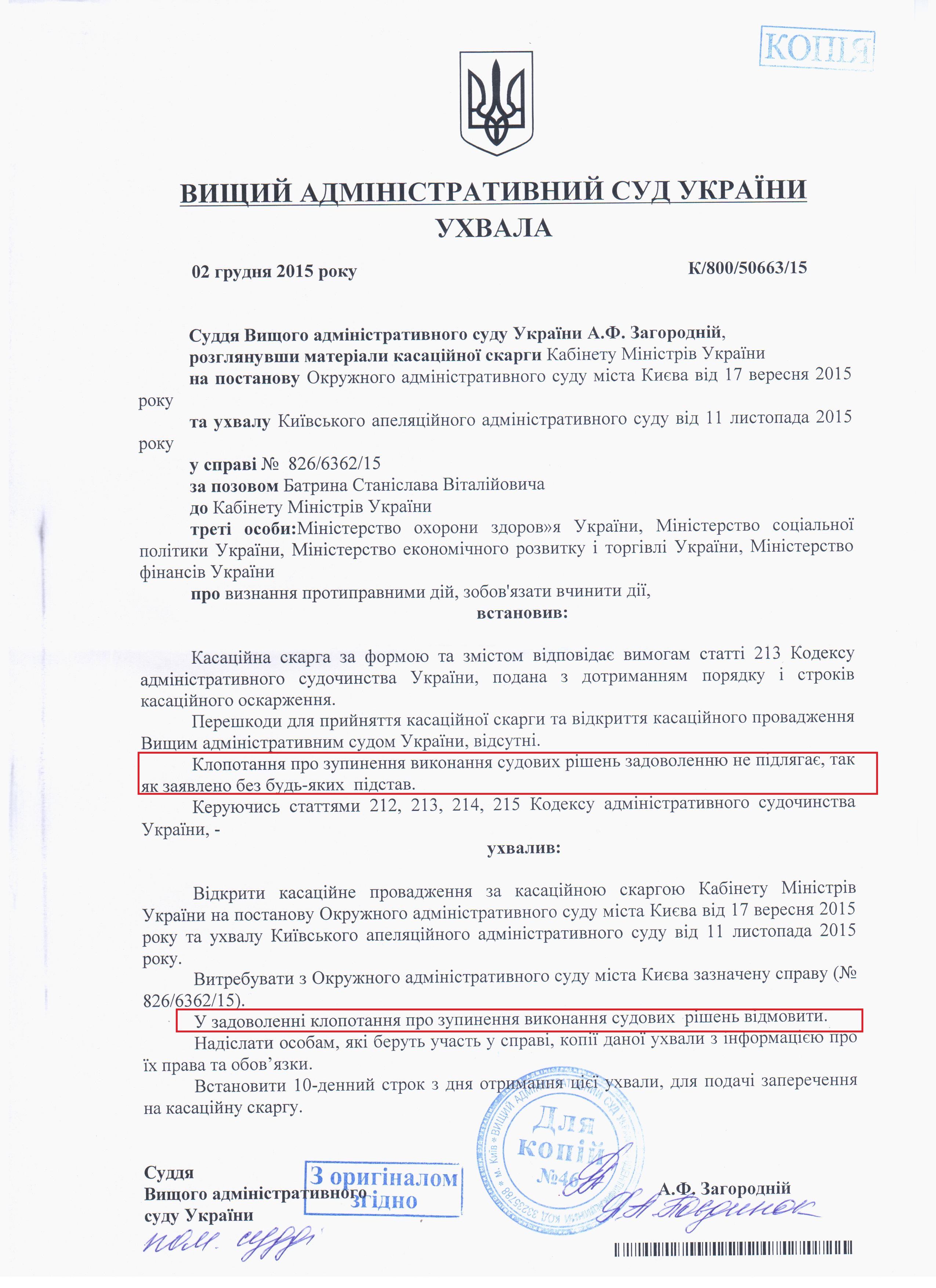 Як повідомляє правозахисник Станіслав Батрін, який є ініціатором позову, про це стало відомо 9 грудня з ухвали Вищого адміністративного суду України по справі К/800/50663/15.