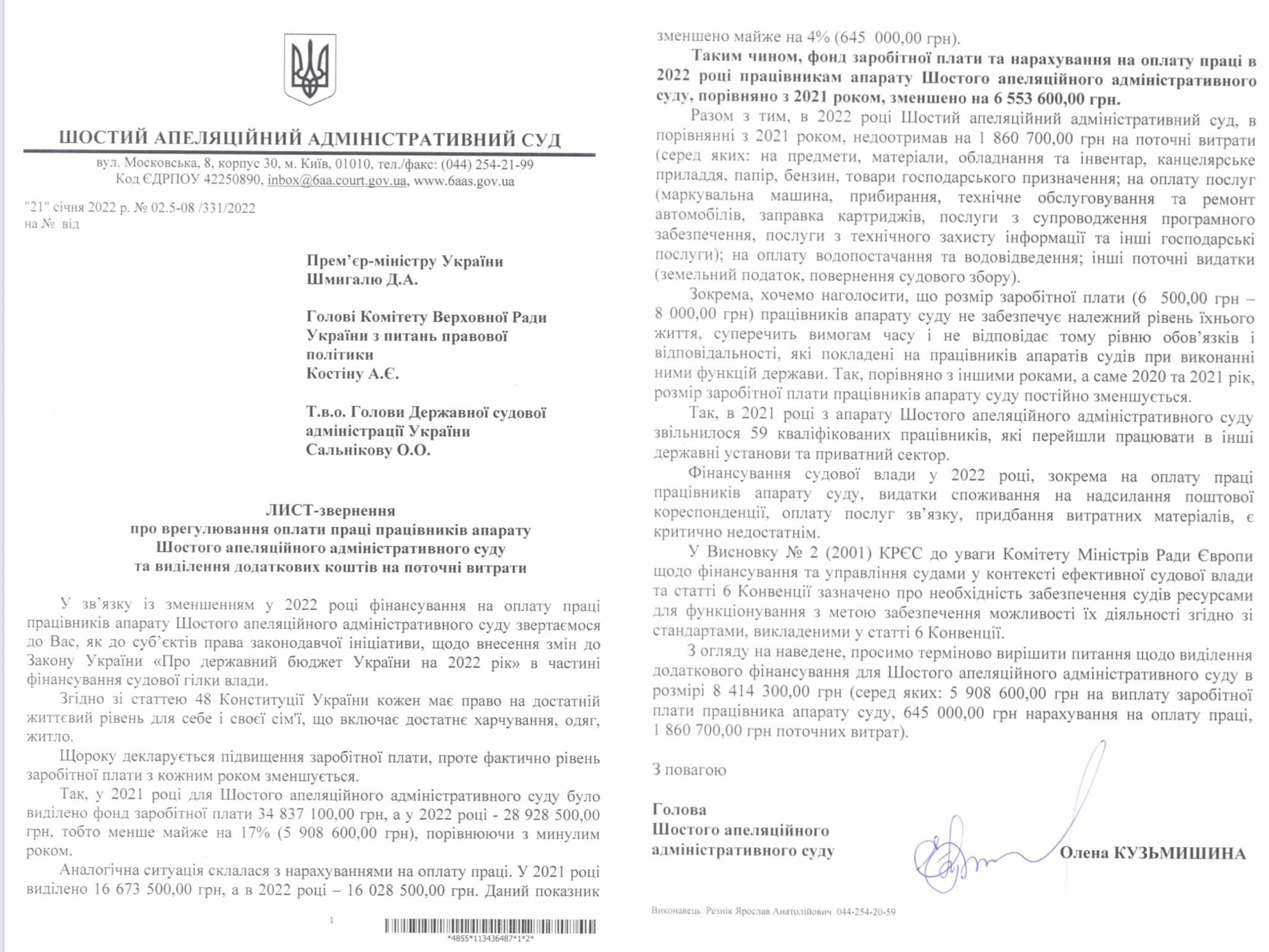 «У 2021 року для Шостого апеляційного адміністративного суду було виділено фонд заробітної плати 34 837 100 грн, а у 2022 році – 28 928 500 грн, тобто менше майже на 17% (5 908 600 грн) порівняно з минулим роком», - йдеться у зверненні голови ШААС Олени Кузьмишиної.