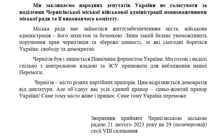 Ми знаємо ситуацію в Запоріжжі, де немає голови, ми знаємо ситуацію по Полтаві, по Кривому Рогу, по прифронтових громадах, де не утворені військові адміністрації. У Чернігівській області російських військ немає, немає сьогодні загрози, за офіційною інформацією від нашої розвідки та військового керівництва. І коли вноситься подання на ліквідацію місцевого самоврядування, то це безпрецедентне рішення для всієї країни, для наших партнерів, і насамперед — для чернігівців.