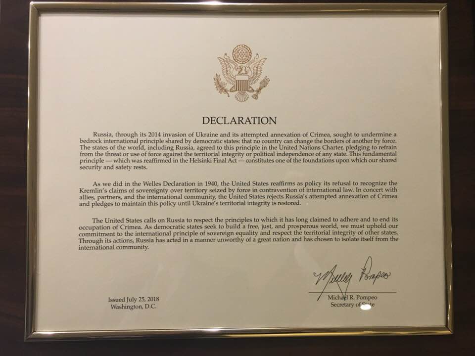 Документ символізує визнання американською стороною, що "Крим - це Україна".