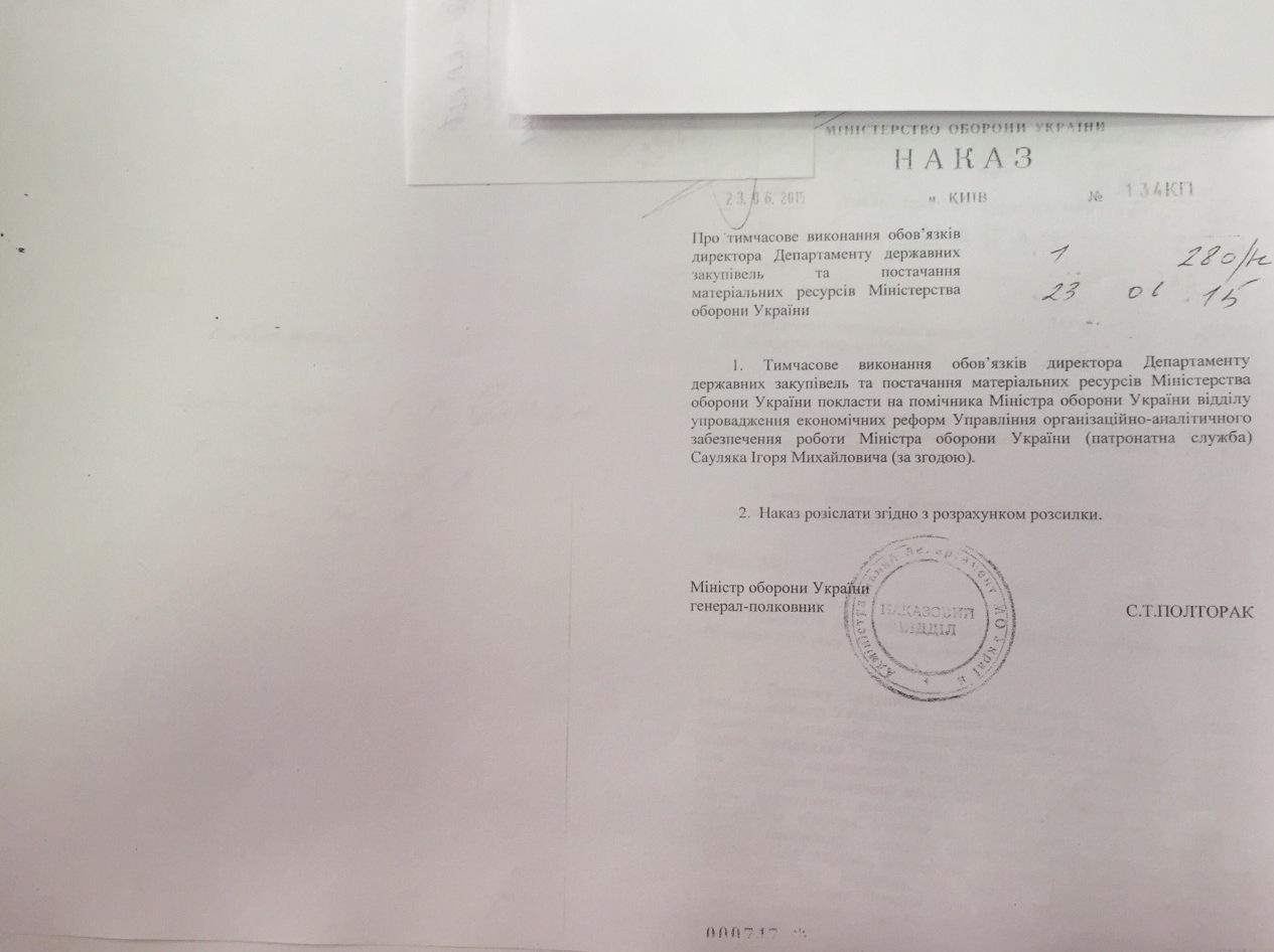 У розпорядженні ZN.UA у п'ятницю опинився наказ міністра оборони України, згідно з яким виконуючим обов'язки директора департаменту з держзакупівель та постачання матеріальних ресурсів призначається Ігор Сауляк.