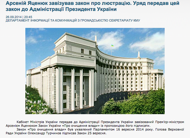 Сьогодні, 26 вересня, прес-служба Кабінету міністрів України повідомила, що відомство передало в Адміністрацію президента України завізований прем'єр-міністром Арсенієм Яценюком закон України "Про очищення влади" з пропозицією його підписати.