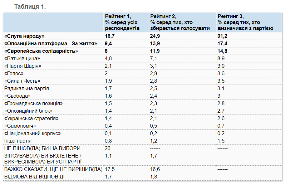 За партію "Європейська солідарність" готові проголосувати 14,8% респондентів, а за "Батьківщину" - 8,9% опитаних. Ще 3,9% українців проголосували б за "Партію Шарія", а за "Голос" - 3,6%.