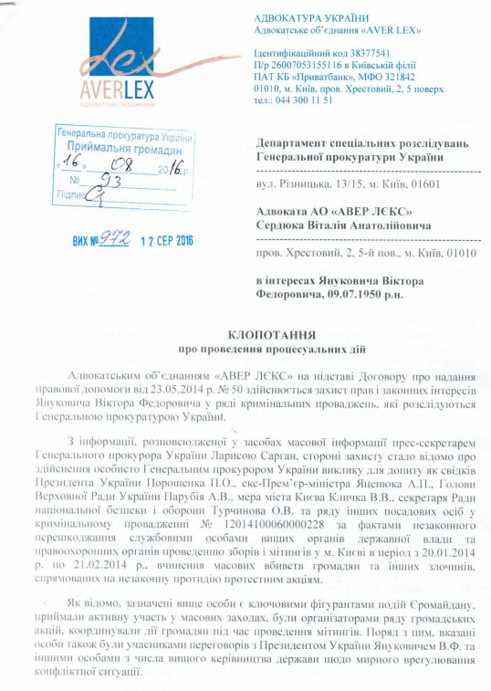 "Офіційне клопотання до ГПУ було подано у вівторок", - повідомив адвокат Віталій Сердюк, передає "Українська правда".