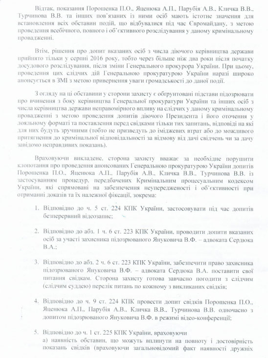 Екс-президент України Віктор Янукович вимагає від Генпрокуратури проведення одночасного допиту (очної ставки) з президентом Петром Порошенко, екс-прем'єром Арсенієм Яценюком, головою Верховної Ради Андрієм Парубієм, мером міста Києва Віталієм Кличком і секретарем РНБО Олександром Турчиновим.