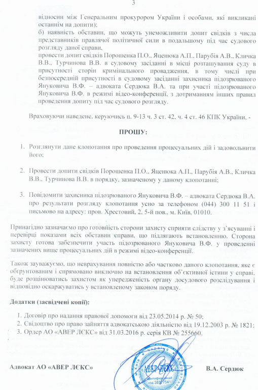 Крім того, Янукович просить про проведення очної ставки з іншими посадовими особами, прізвища яких адвокати не вказали, проте зазначили, що вони викликалися для дачі свідчень у "справі Майдану".
