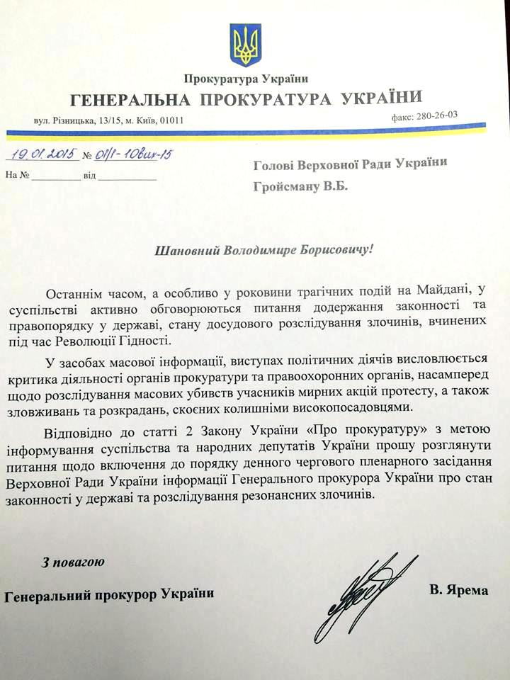 Генеральний прокурор України Віталій Ярема просить Верховну Раду заслухати його. Відповідний запит він надіслав на ім'я спікера ВР Володимира Гройсмана у понеділок, 19 січня.