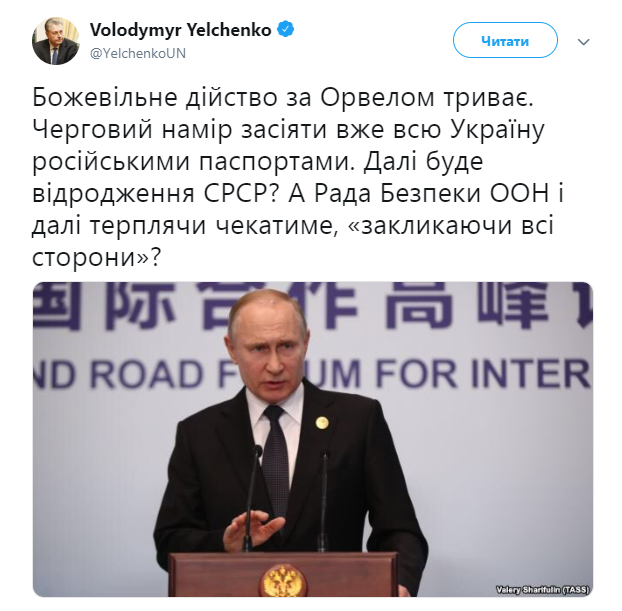 Постійний представник України в ООН Володимир Єльченко прокоментував видачу українцям російських паспортів, про що говорив президент РФ Володимир Путін, порівнявши її з сюжетом роману британського письменника Джорджа Орвелла "1984"; про це український постпред написав у своєму Twitter.