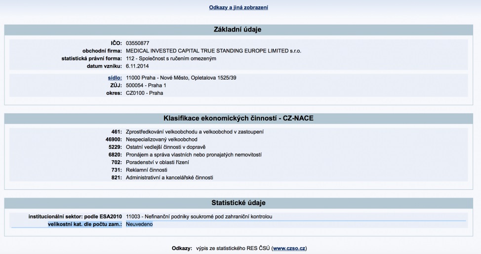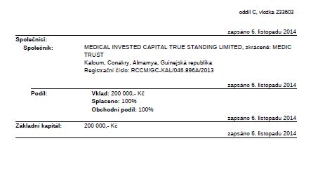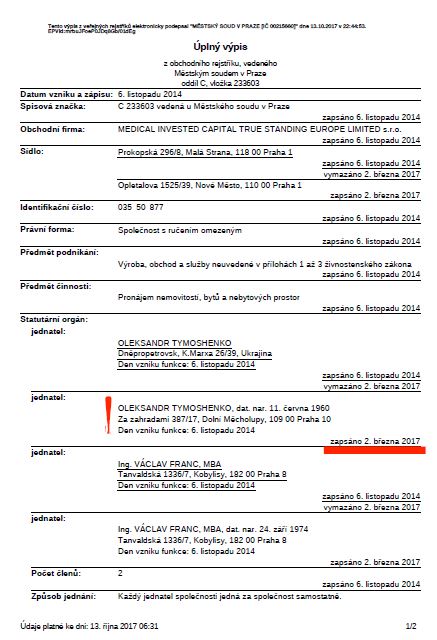 Зокрема у деклараціях про доходи лідера "Батьківщини" відсутня компанія MEDICAL INVESTED CAPITAL TRUE STANDING EUROPE LIMITED s.r.o. (скорочено - MEDIC TRUST), власником якої є гвінейська фірма MEDIC TRUST. Чеська фірма з гвінейським засновником займається орендою нерухомості. Олександр Тимошенко є керуючим партнером цієї компанії з 2014 року. Компанія з такою ж назвою зареєстрована і в Лондоні.