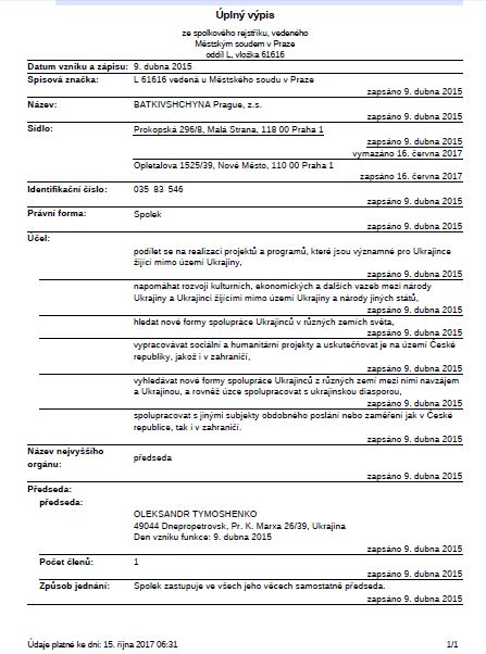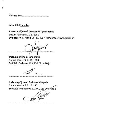 Що стосується ГО "Батьківщина" в Чехії, то окрім Олександра Тимошенка її засновниками вказані Яна Даніо та Галина Андрейців. Основна мета організації – співпраця українців.