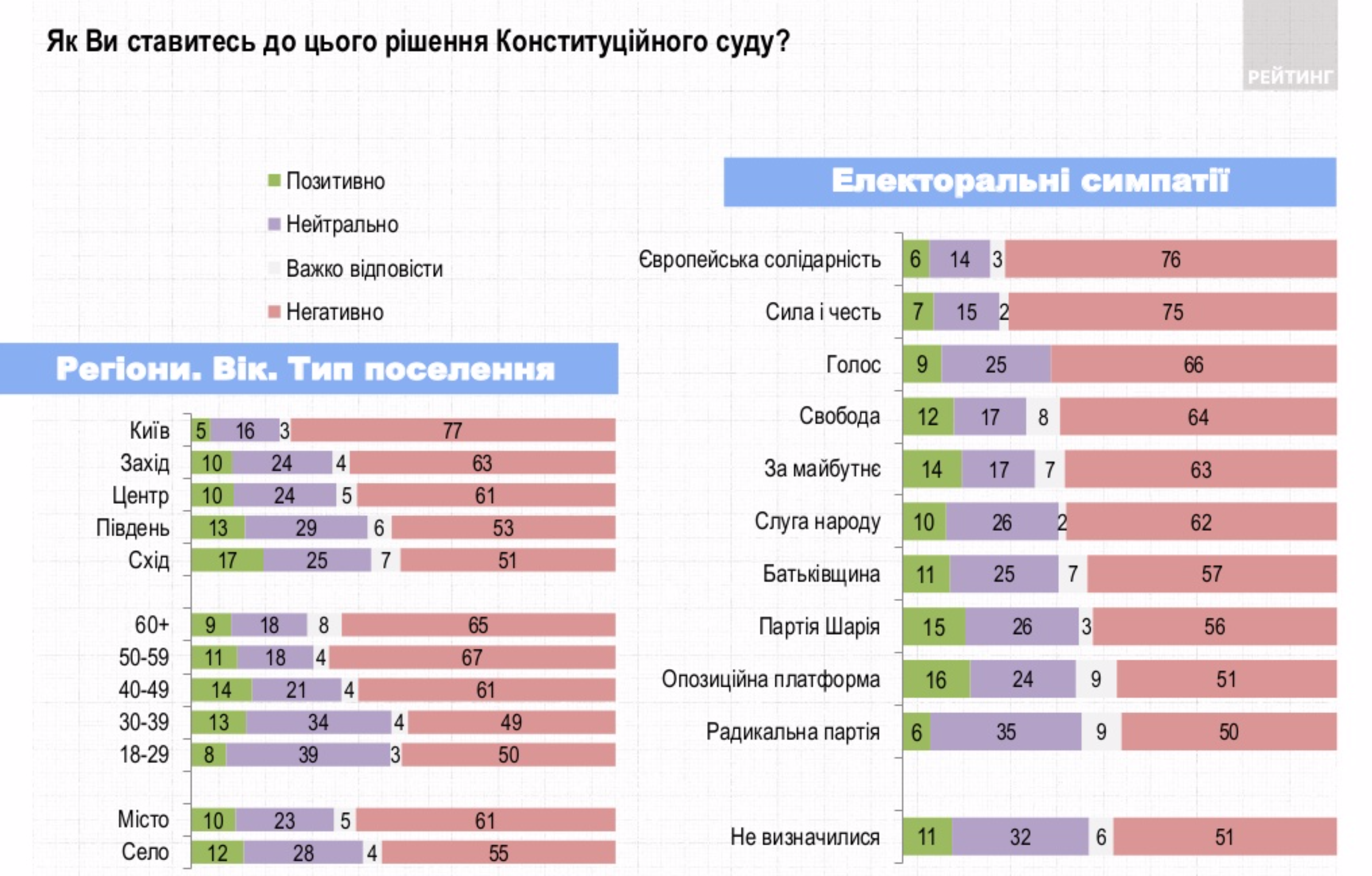Крім цього, понад 60% респондентів заявили про свою недовіру до суду. Протилежної думки 19%. Серед тих, хто ознайомлений з останнім скандальним рішенням, про недовіру КСУ заявили 78%.