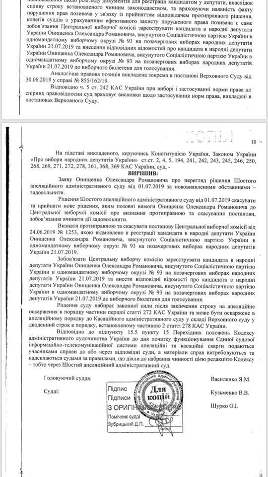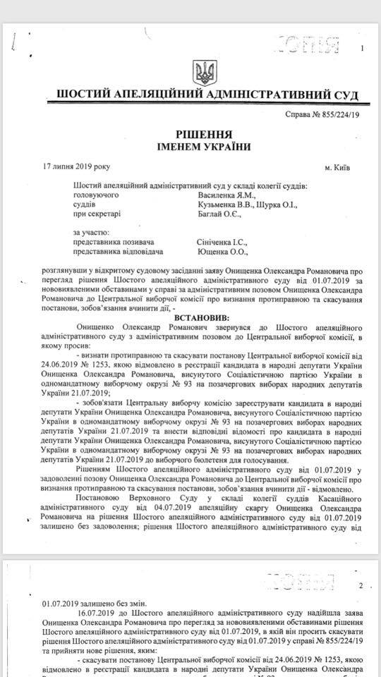 Шостий апеляційний адмінсуд зобов'язав Центрвиборчком зареєструвати Онищенка кандидатом у народні депутати. Онищенко надав суду документи про те, що перебуває поза межами держави, бо нібито "представляв Україну на змаганнях із кінного спорту".