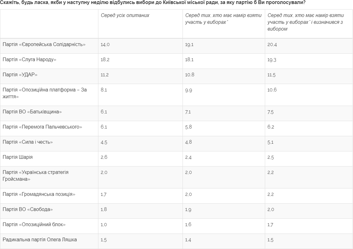 Якби найближчим часом проходили вибори до Київської міської ради, найбільшу підтримку виборців отримали б «Слуга народу» (за неї готові проголосувати 18% усіх опитаних, або 19% тих, хто готовий взяти участь у виборах і визначився, за яку партію голосуватиме) та «Європейська солідарність» (відповідно 14% і 20%).