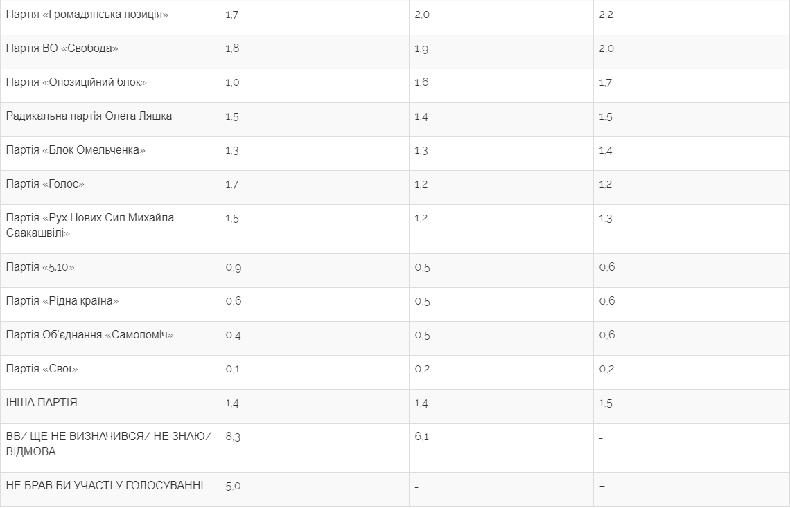 Партію Кличка «УДАР» готові підтримати 11% киян (12% серед тих, хто визначився), «Опозиційну платформу-За життя» – 8% і 11% відповідно, «Батьківщину» – 6% і 8%, «Перемогу Пальчевського» – 6% і 6%, «Силу і честь» Смєшка – 5% і 5%. Інші політичні сили користуються підтримкою від 0,1 до 3% киян.