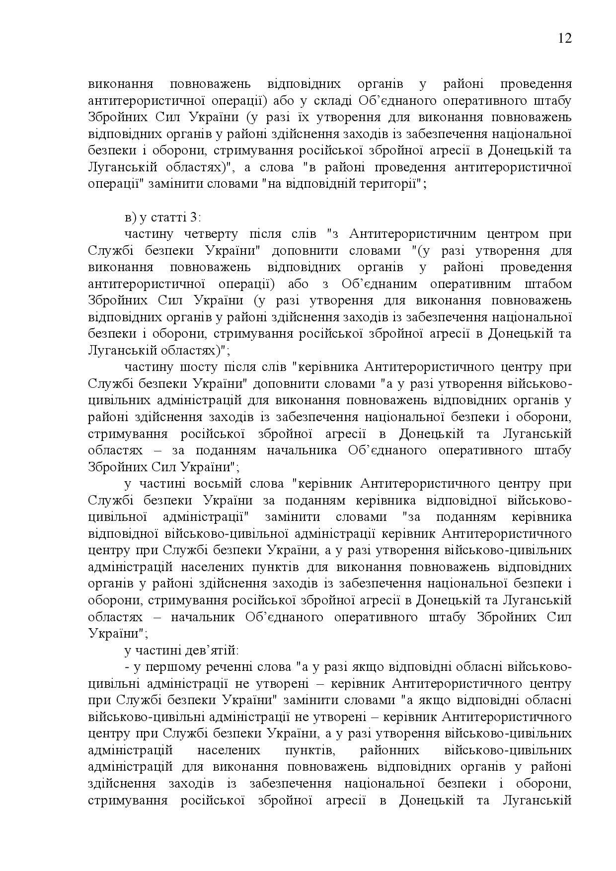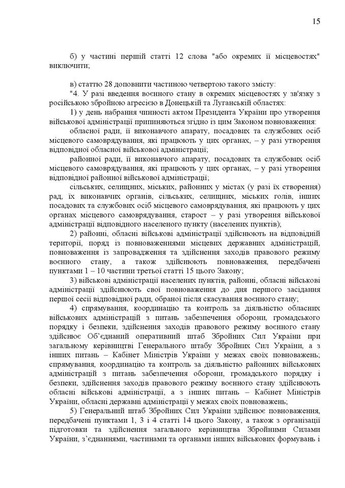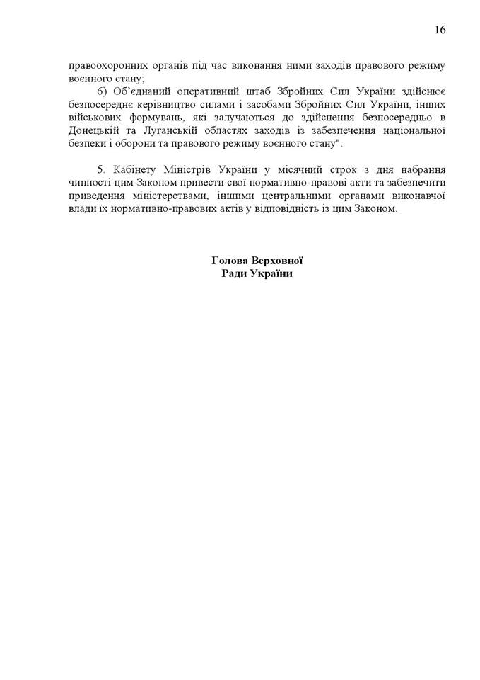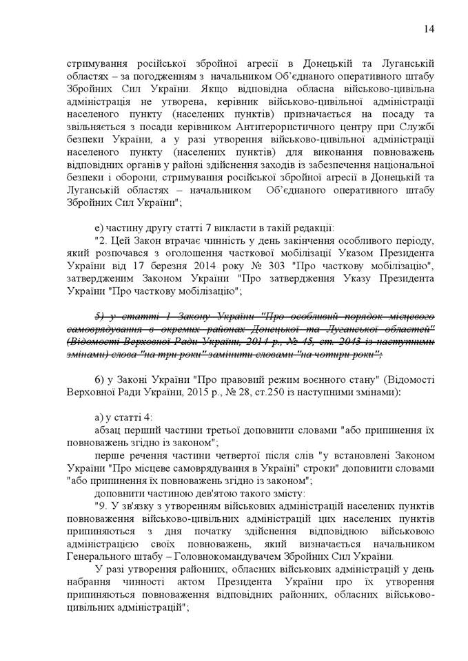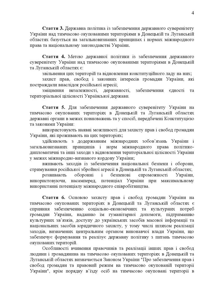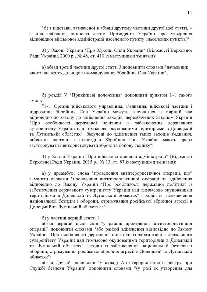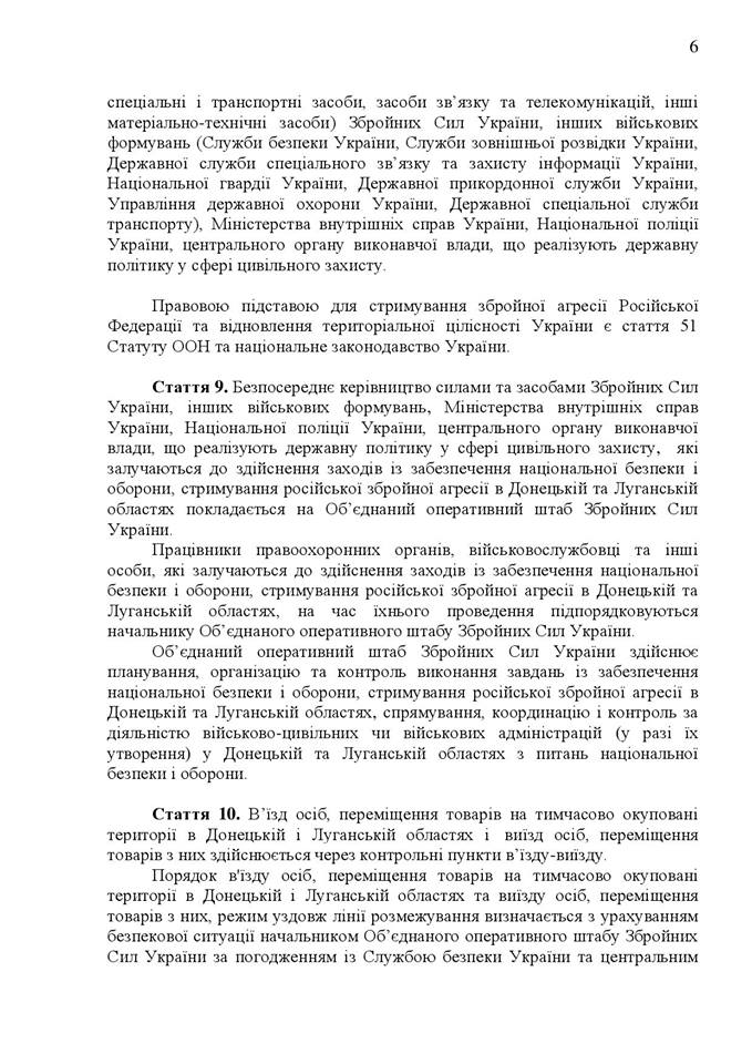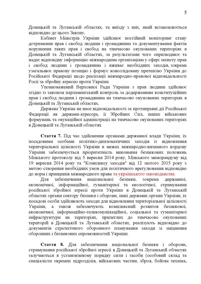 Крім того, у тій самій частині документу йдеться про те, що Верховна Рада України схвалює рішення президента країни про використання української армії та інших військових формувань для стримування російської агресії на території Донецької і Луганської областей та забезпечення державного суверенітету у тимчасово окупованих районах цих областей.