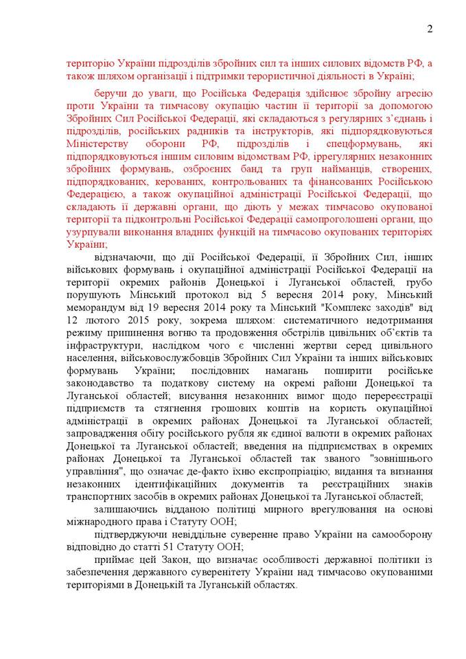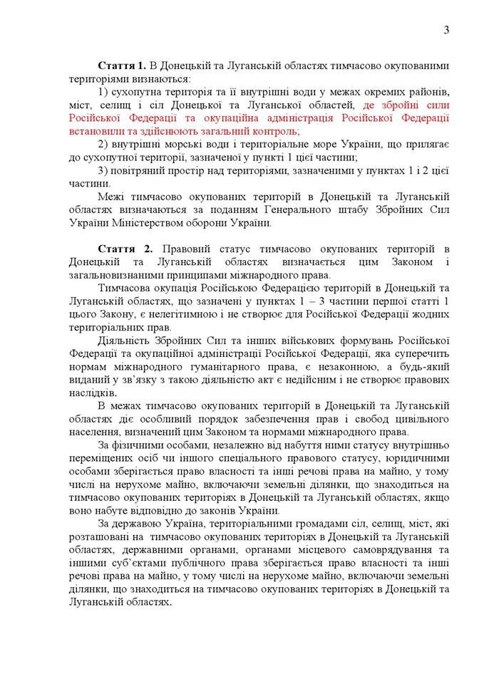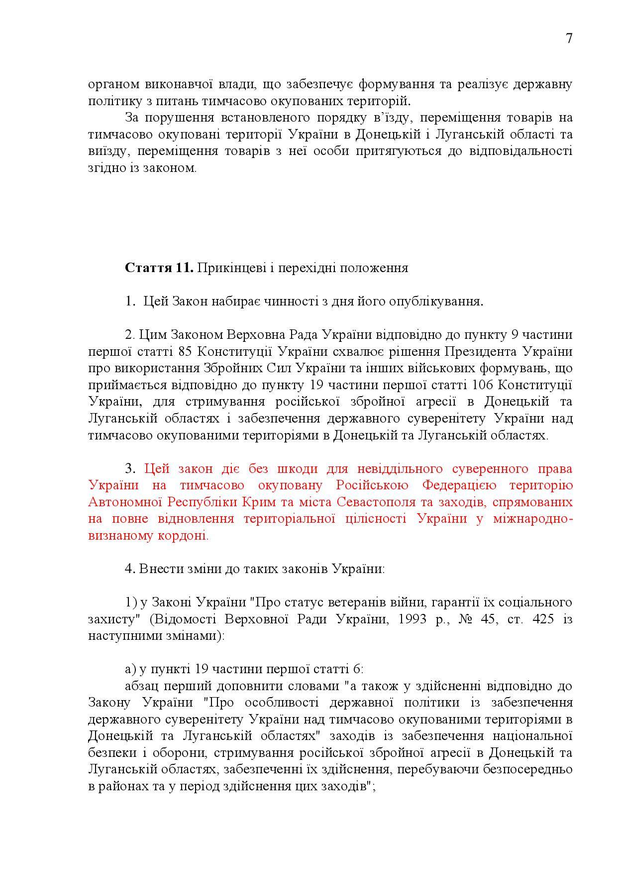 "Цей закон діє без шкоди для невіддільного суверенного права України на тимчасово окуповану Російською Федерацією територію Автономної Республіки Крим та міста Севастополь та заходів, спрямованих на повне відновлення територіальної цілісності України у міжнародно-визначеному кордоні", - йдеться у частині перехідних та прикінцевих положень документу.