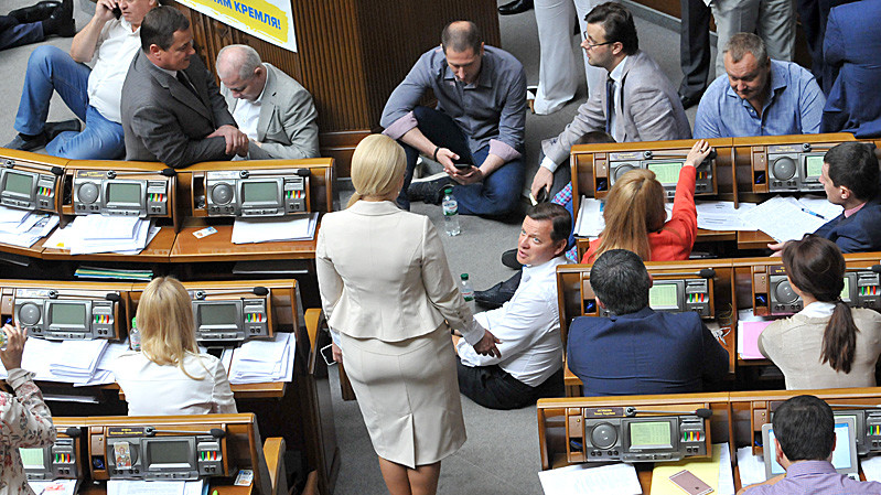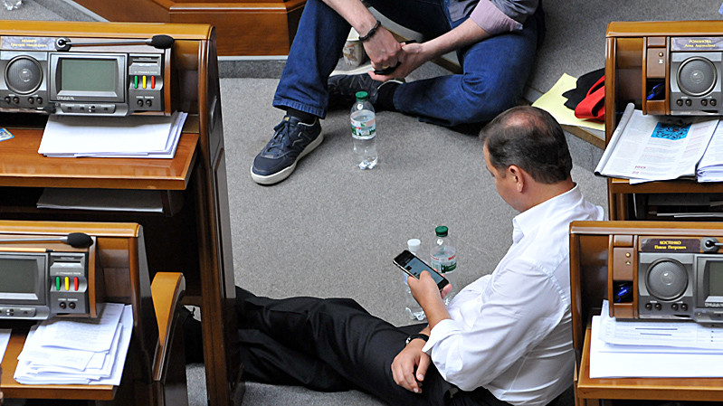 На засіданні Верховної Ради 12 липня депутати "Радикальної партії" продовжили "сидячий протест" в залі парламенту, а представники коаліції "захищали" трибуну, пропускаючи до неї спікерів, від блокування учасниками протесту.