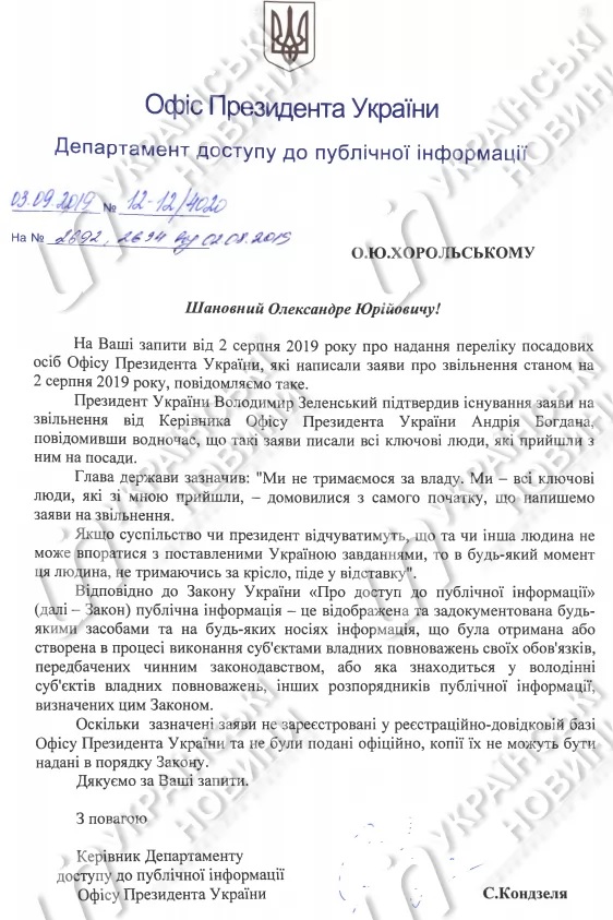 "Президент України Володимир Зеленський підтвердив існування заяв про звільнення від керівника Офісу президента України Андрія Богдана, одночасно повідомивши, що такі заяви писали всі ключові люди, які прийшли з ним на посади", - йдеться у відповіді.