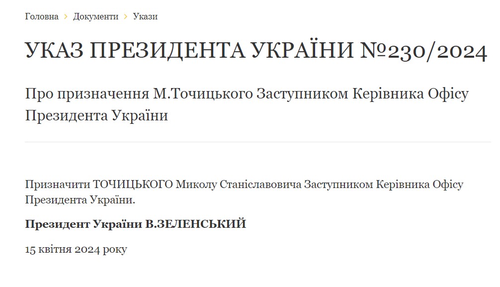 Президент України Володимир Зеленський призначив колишнього заступника міністра закордонних справ Миколу Точицького заступником глави Офісу президента. Відповідний указ розміщений на сайті Офісу президента 15 квітня.