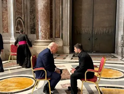 Президент України Володимир Зеленський в суботу, 26 квітня, проводить зустріч із американським президентом Дональдом Трампом у Ватикані, зазначив речник українського президента Сергій Никифоров у коментарі "Суспільному". Це їхня перша зустріч після перепалки в Білому домі, яка відбулася наприкінці лютого.