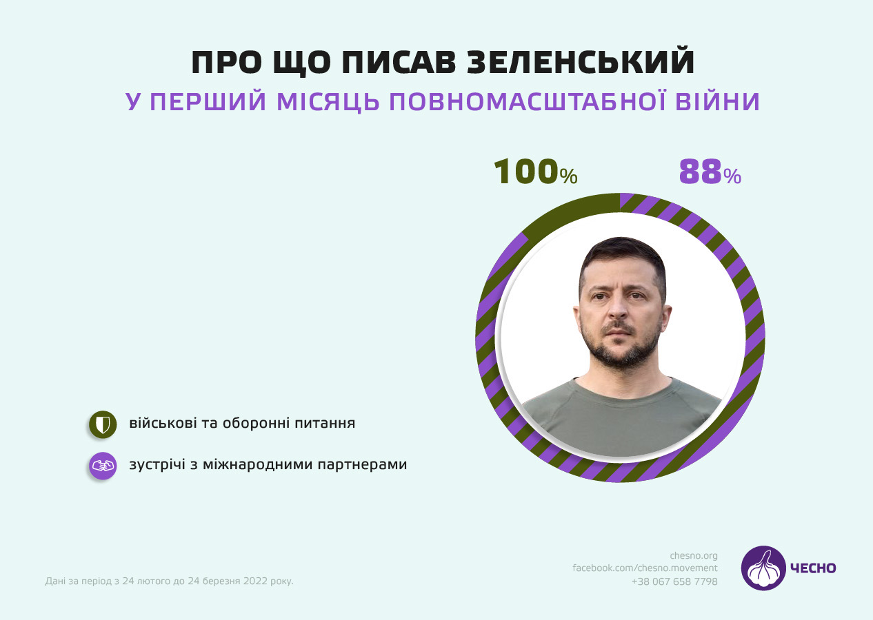 Тематично більшість дописів стосується зустрічей Зеленського з міжнародними партнерами та угод з ними про допомогу. У перший місяць вторгнення РФ таких дописів було 88%. Щоденні відеозвернення президента дуже рідко розміщувалися в Twitter.