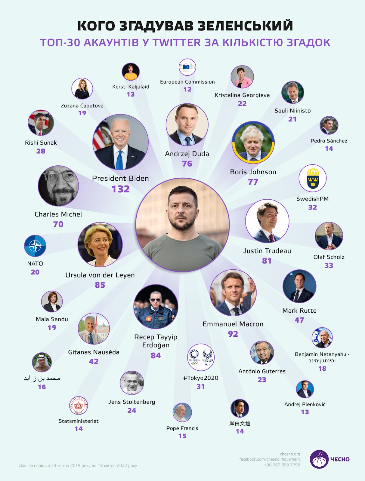 Президент США Джо Байден став лідером за кількістю згадок на сторінці Зеленського - позначений 132 рази. Президент України також часто згадував у дописах свого французького колегу Еманнуеля Макрона та президентку Європейської комісії Урсулу фон дер Ляєн.