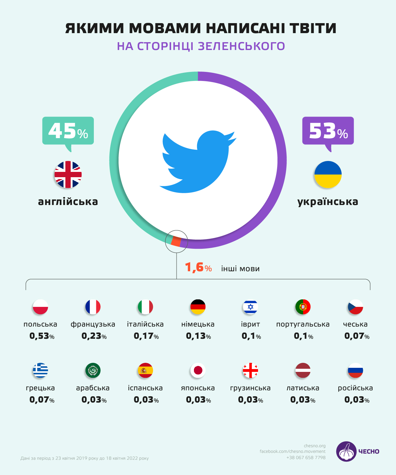 Зеленський значно збільшив кількість дописів іноземними мовами, особливо англійською - більше половини від усіх твітів на сторінці. Окрім української, є дописи написані також французькою, польською, та іншими мовами.