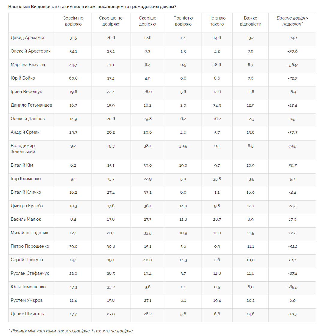 Більшість опитаних не довіряють голові «Батьківщини» Юлії Тимошенко (80,5%), ексраднику голови ОП Олексію Арестовичу (79%), голові ОПЗЖ Юрію Бойку (78%), експрезиденту Петру Порошенку (70%), депутатці Мар’яні Безуглій (66%), голові фракції «Слуга народу» у ВРУ Давиду Арахамії (58%), голові офісу президента Андрію Єрмаку (55,5%) та голові Верховної Ради Руслану Стефанчуку (50,5%).