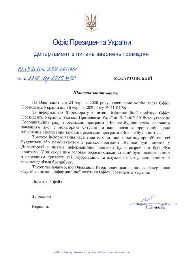 Саме цей підрозділ, за інформацією ОП, готувало брендбук для освітлення програми "Велике будівництво". У супровідному листі, направленому главам ОДА, макети інформаційних матеріалів про цей проект просять узгоджувати саме з Курдинович.