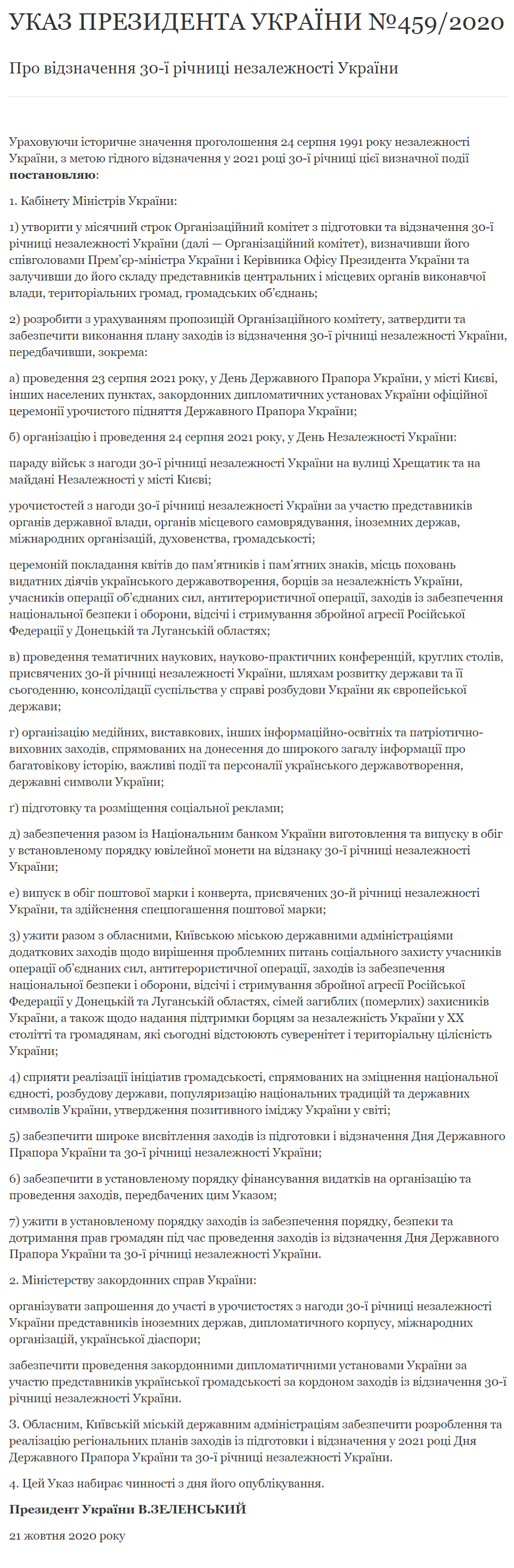 Також згідно указ Зеленський вимагає від Кабінету міністрів забезпечити виконання плану, який передбачає організацію і проведення 24 серпня 2021, в День Незалежності України: