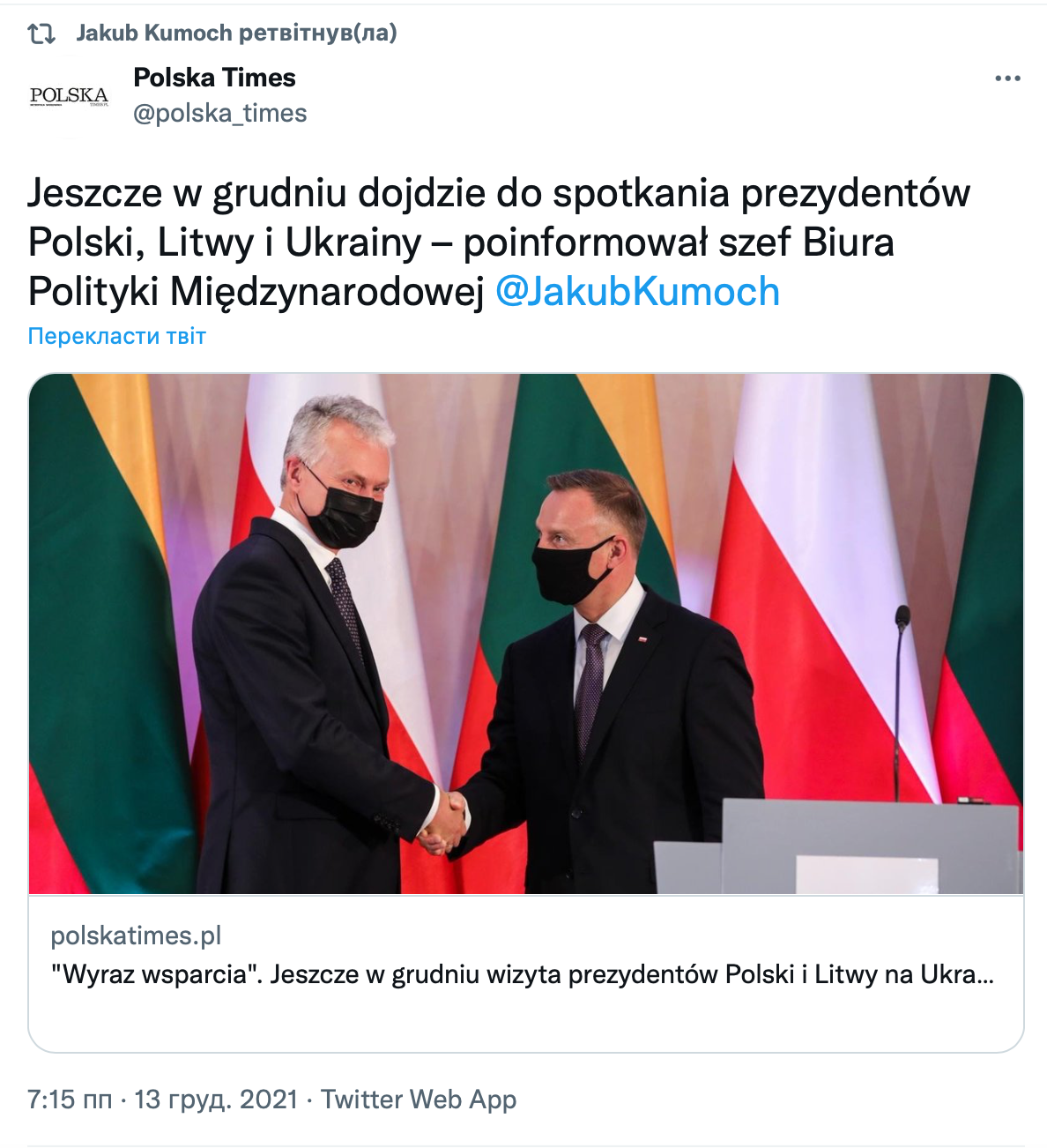 "Президенти Польщі, Литви та України - Анджей Дуда, Гітанас Науседа та Володимир Зеленський - зустрінуться 20 грудня в Україні в рамках саміту Люблінського трикутника, щоб обговорити ситуацію з безпекою у нашому регіоні", - написав Кумох у вівторок у Twitter.