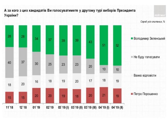 За тиждень до виборів президента у другому турі за коміка Володимира Зеленського готові проголосувати 52% українців, за чинного главу держави Петра Порошенка свої голоси збираються віддати 19%. Також ще 19% громадян не визначилися, а 10% - не мають наміру голосувати. Такі дані свіжого соціологічного опитування опублікувала група "Рейтинг".