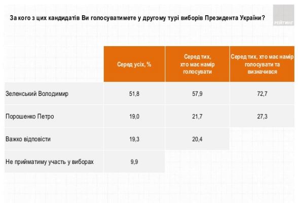 Серед тих, хто має намір голосувати у другому турі 58% віддадуть свої голоси за Володимира Зеленського, 22% - за Петра Порошенка, ще 20% - не визначились. Серед тих, хто точно має намір голосувати в другому турі і визначився з вибором: 73% проголосують за Зеленського, 27% - за Порошенка.