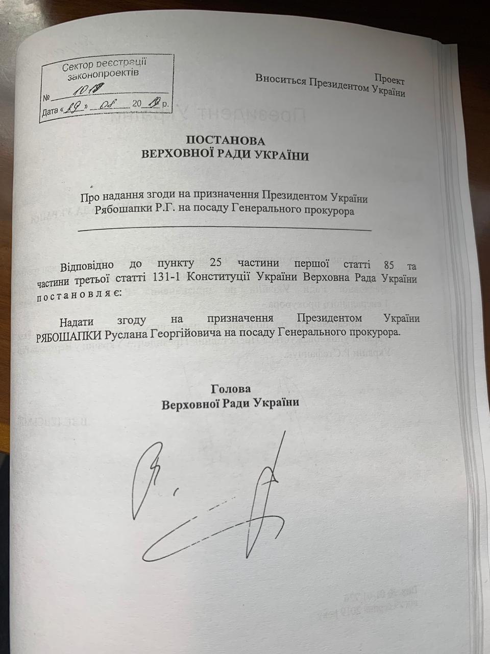 "У відповідності з Конституцією України Верховна Рада постановляє: надати згоду на призначення президентом України Рябошапки Руслана Георгійовича на посаду генерального прокурора України", - йдеться в постанові.