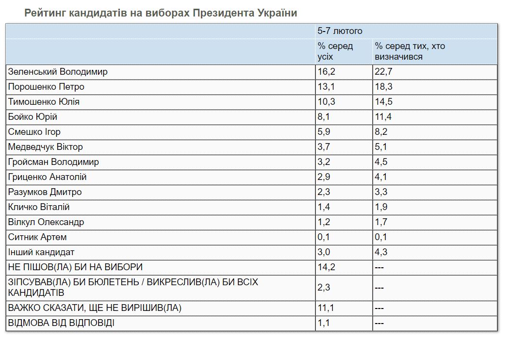 Зі всіх респондентів 14,2% зазначили, що не пішли б на вибори, ще 2,3% проголосували б проти всіх чи зіпсували бюлетень. Не визначилися з вибором 11,1% українців, а 1,1% – відмовилися відповідати на питання соціологів.