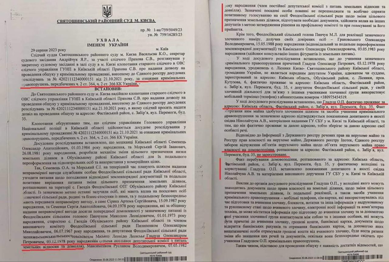 Так само, без жодних оголошень, порядку денного, присутності хоч одного свідка депутати-заколотники Феодосіївської СТГ провели свою, з дозволу сказати, «сесію», яка отримала в громаді ідентичну назву. На ній вони обрали «секретарем» Олександра Гладуша. Раніше він очолював раду села Лісники. Це село — певний конкурент Кончі-Заспи за вартістю землі та маєтків, але розташоване ближче до столиці. З декларації «секретаря» видно, що він, отримуючи досить скромну зарплатню на попередній посаді й не ведучи жодного бізнесу, має декілька квартир і земельних ділянок у Київській області, автомобіль «Тойота Ленд Крузер», мотоцикл «Ямаха» й узагалі такий бідолаха, що рідна мама позичила йому на прожиття 1,5 млн грн зі своєї маленької пенсії. Доповнює портрет постанова Святошинського суду від 29 серпня 2023 року про проведення обшуку в Олександра Гладуша за фактичною адресою його проживання. В постанові виступає фігурантом іще один депутат — Руслан Максименко як співучасник Гладуша.