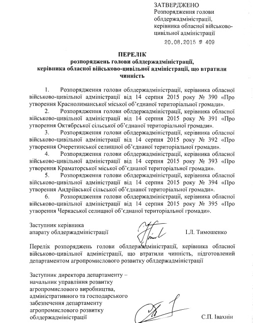 Про це йшлося у розпорядженні губернатора № 390-395 від 14 серпня, якими були створені Черкаська селищна, Андріївська сільська, Краматорська міська, Очеретинская селищна, Октябрськая сільська, Краснолиманська міська територіальні громади.