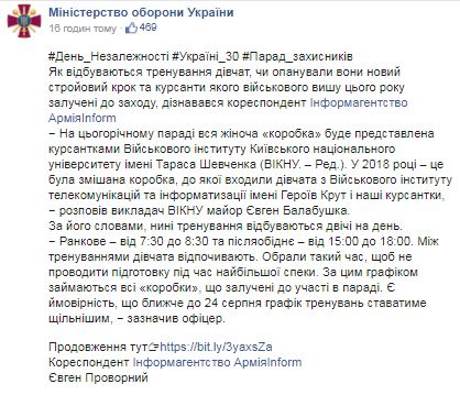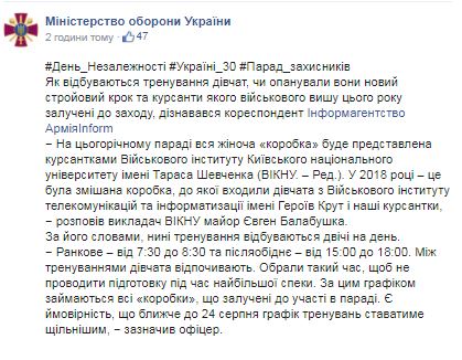 На своїй сторінці у Facebook 1 липня Кондратюк опублікувала фото відповідного посту Міноборони та висловила обурення «маршем на підборах». Вже 2 липня відповідний пост Міноборони на сторінці у Facebook відредагували та видалили звідти лінк на розширений матеріал з цього приводу на armyinform.com.ua. Зазначимо, що на відміну від повідомлення у соцмережі Міноборони на сайті написано, що під час параду «курсантки йтимуть у туфлях на підборах».