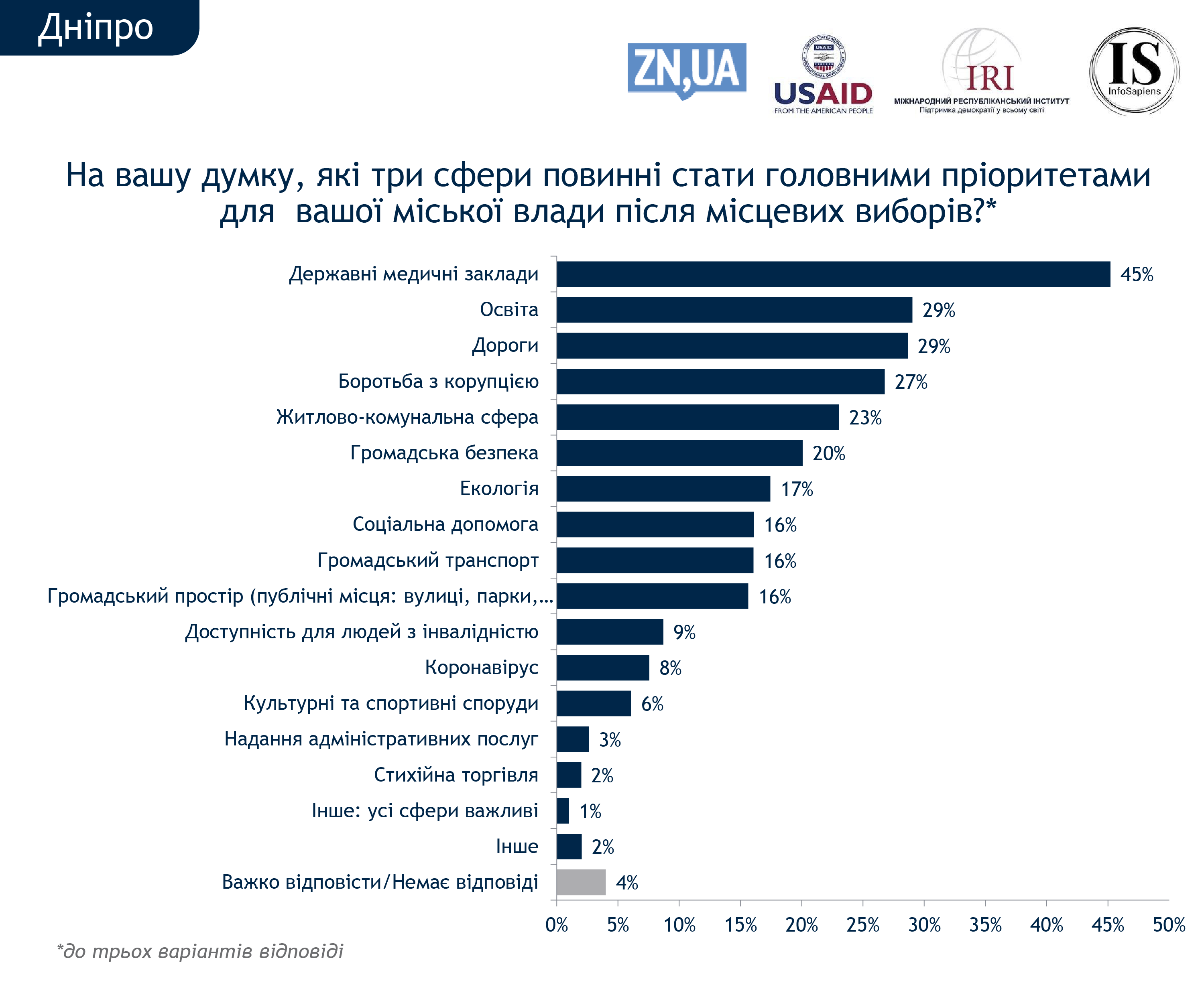 Опитування проведене соціологічною компанією INFO SAPIENS від імені Міжнародного республіканського інституту (IRI). Дані збиралися в місті Дніпро 14-17 вересня 2020 р. методом телефонного інтерв'ю (CATI). Розмір вибірки становить n = 600 постійних жителів міста віком від 18 років. Вибірка є репрезентативною. Статистична похибка не перевищує 4%..