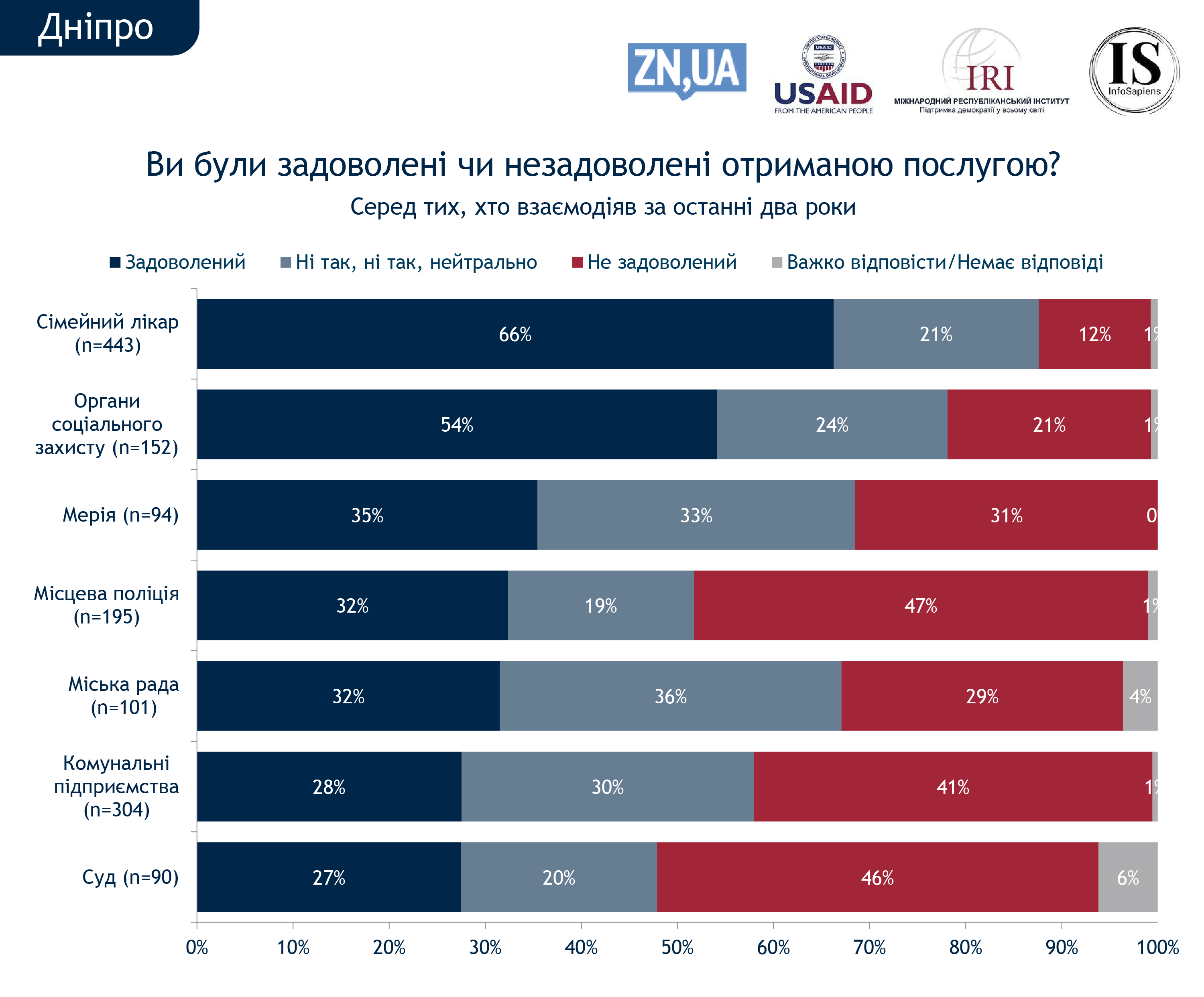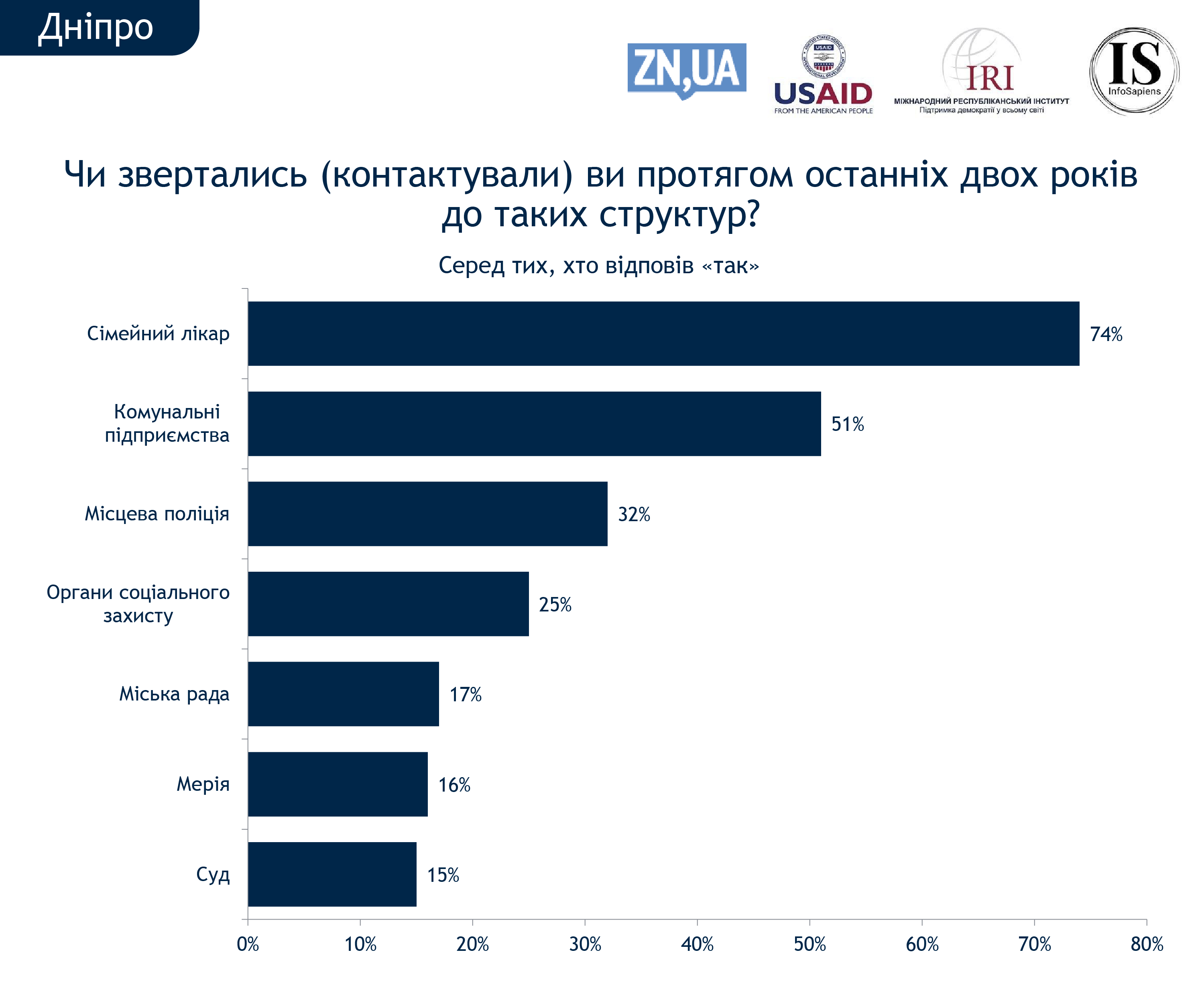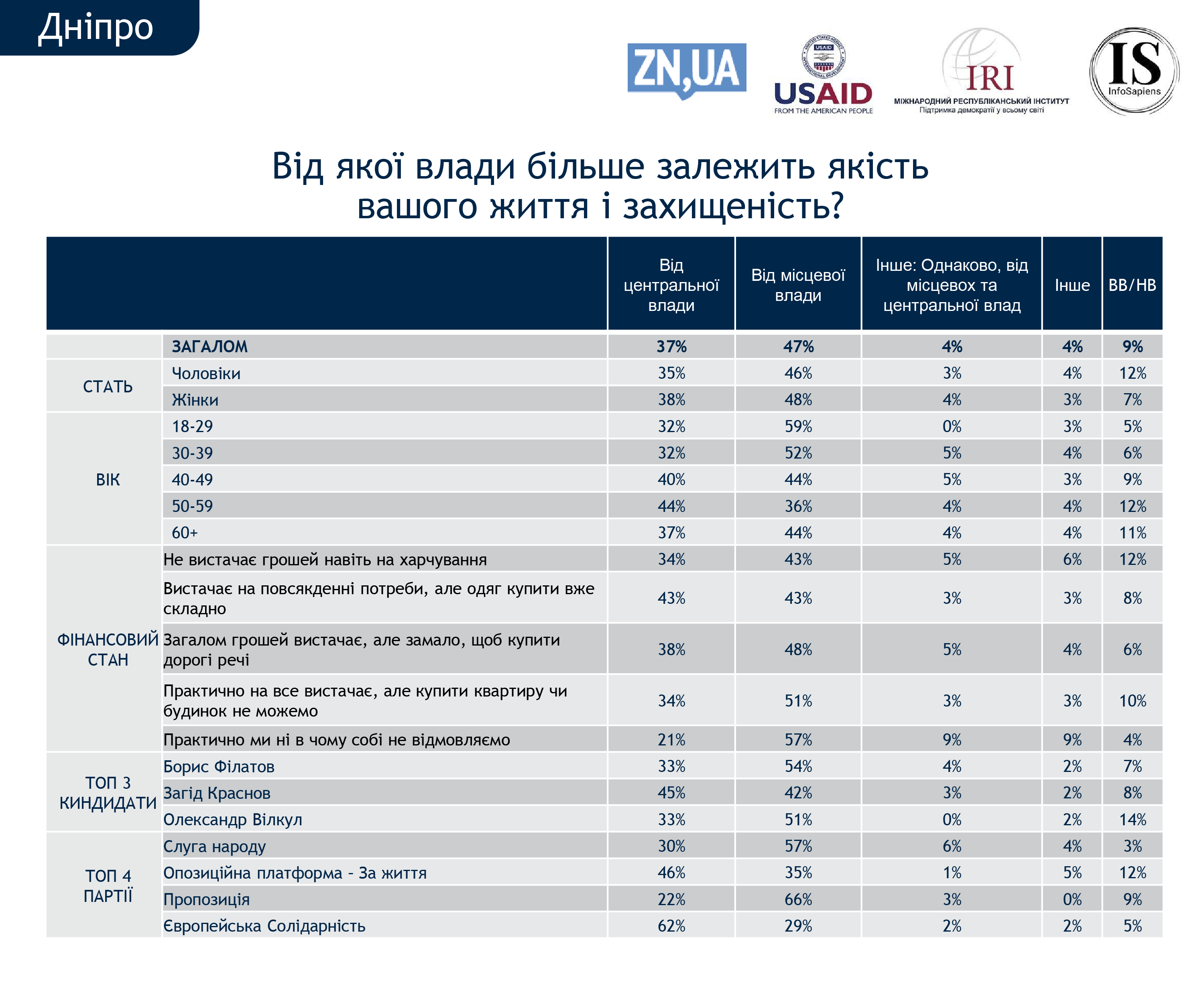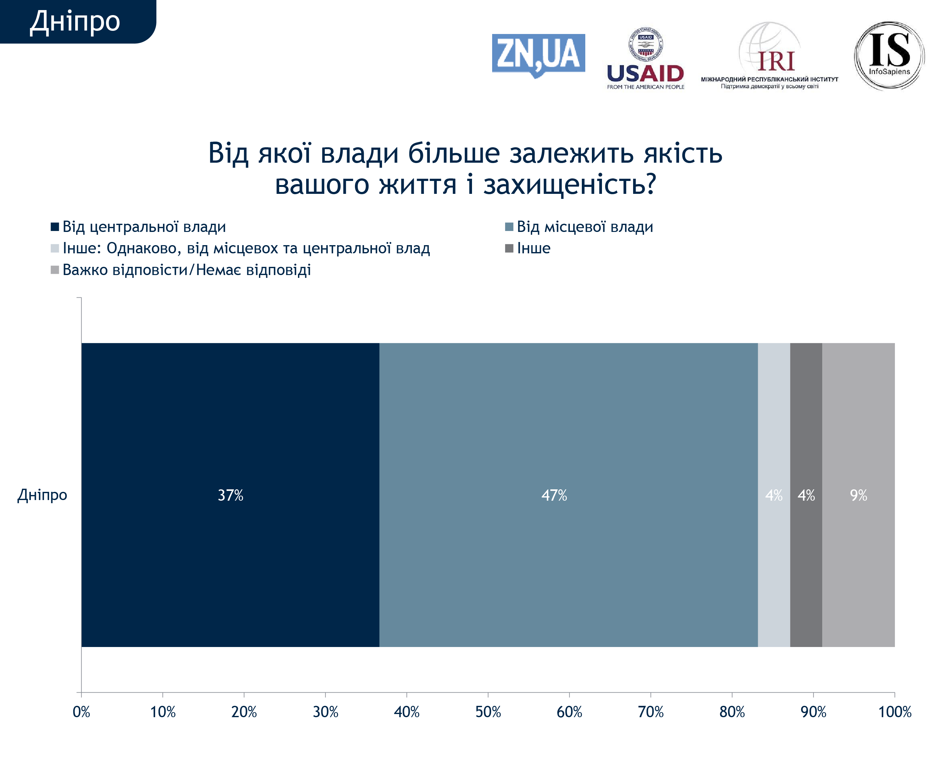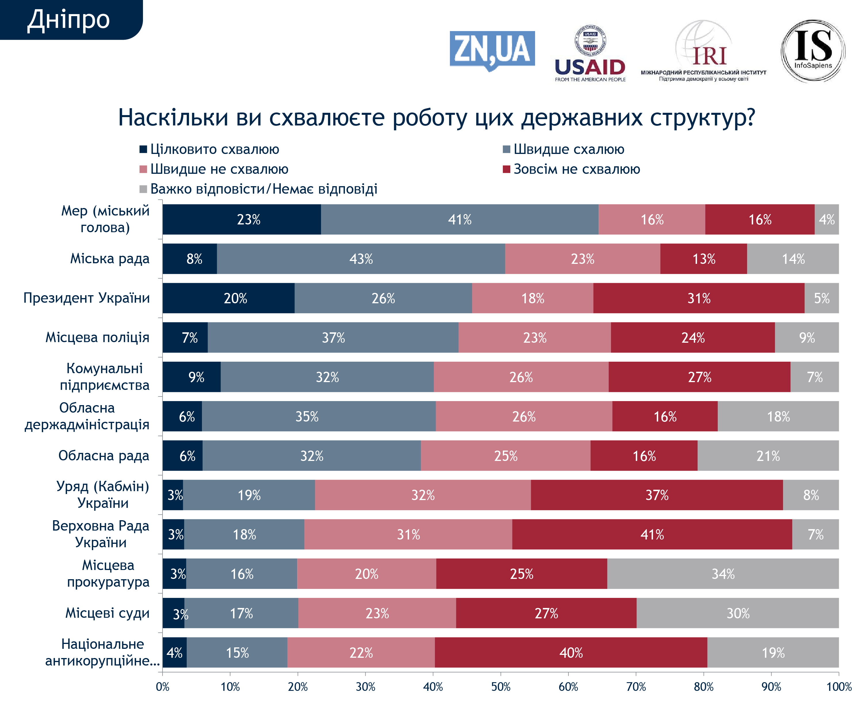 Однак жителі міста хвалять міську владу за вуличне освітлення (61%), їх влаштовує робота ринків та торгових комплексів (52%), половині дніпрян завжди тепло в їх будинках (49%).